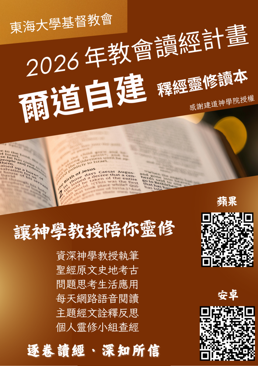 2026年,我們將一同展開全新一年的讀經計畫。從每週一到週日,邀請您每天預留一段固定時間,按照讀經計畫安靜在主前,養成每日讀經、與上帝對話的屬靈習慣。也鼓勵弟兄姊妹與團契或小組的同伴一同閱讀,彼此分享、彼此扶持,在神的話語中加深屬靈生命,並建立更緊密的團契關係。