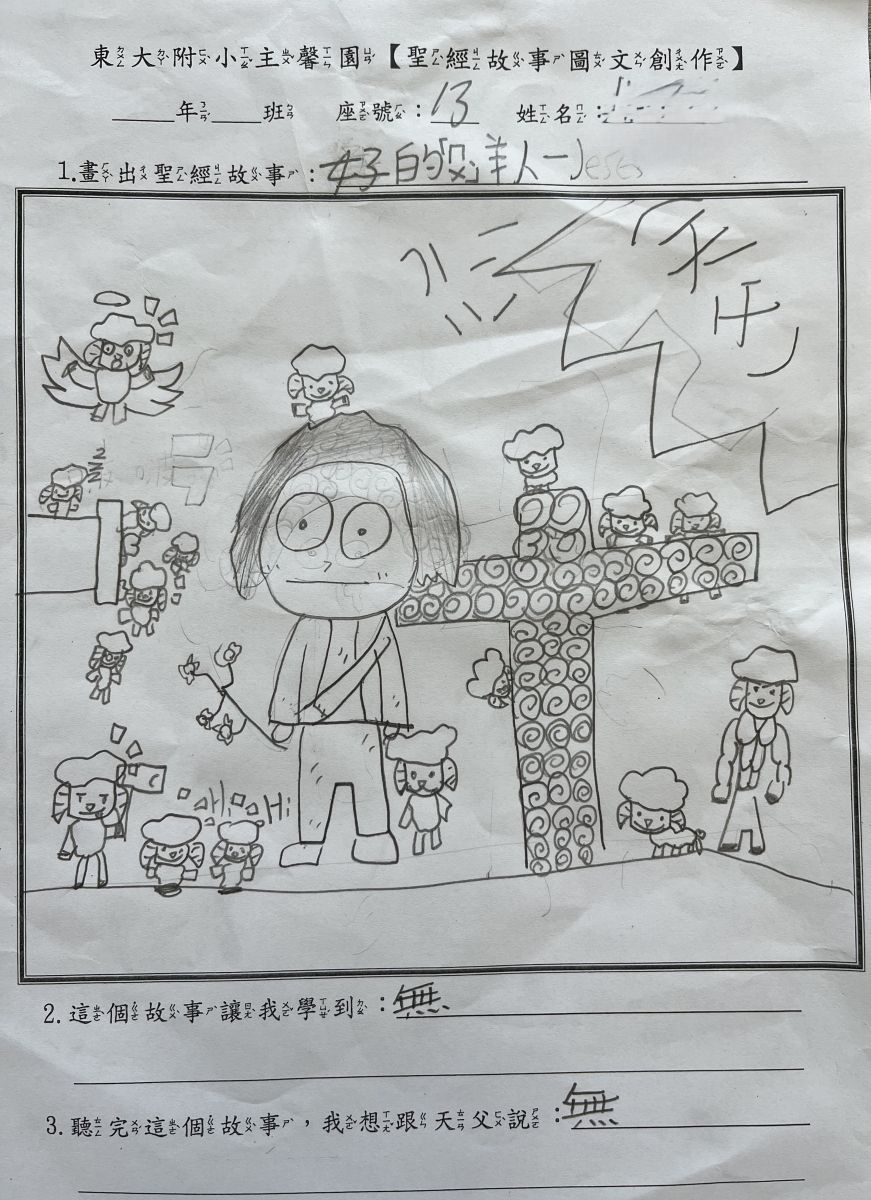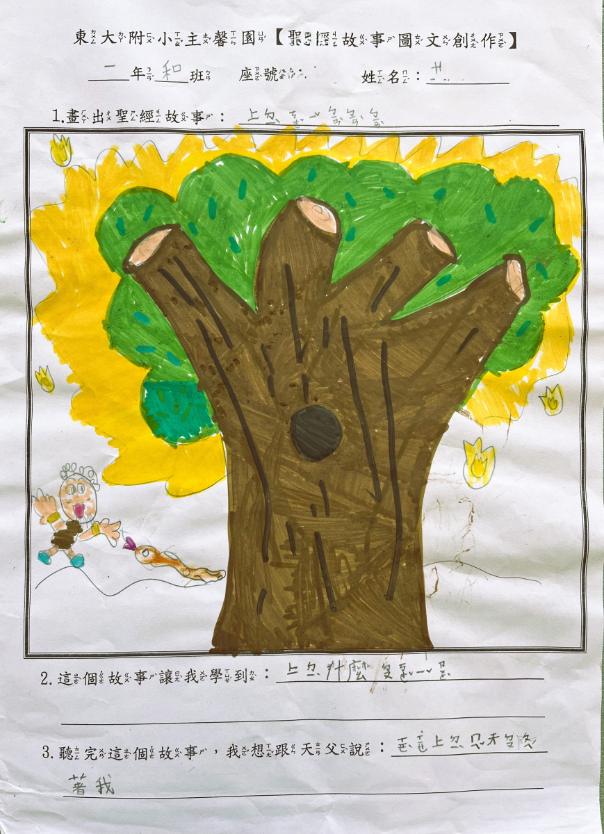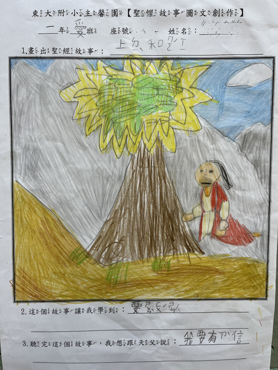 ●說明:小孩在金句教導,或是聖經故事班聽完聖經故事後,都可以來主馨園領取聖經故事圖文創作學習單,自行完成後,交給毓蘭老師,就可以換取小禮物。藉著聖經故事圖文創作,小孩可以複習所學,並且加強印象,且體會故事的意義,以及故事與他們的關係。